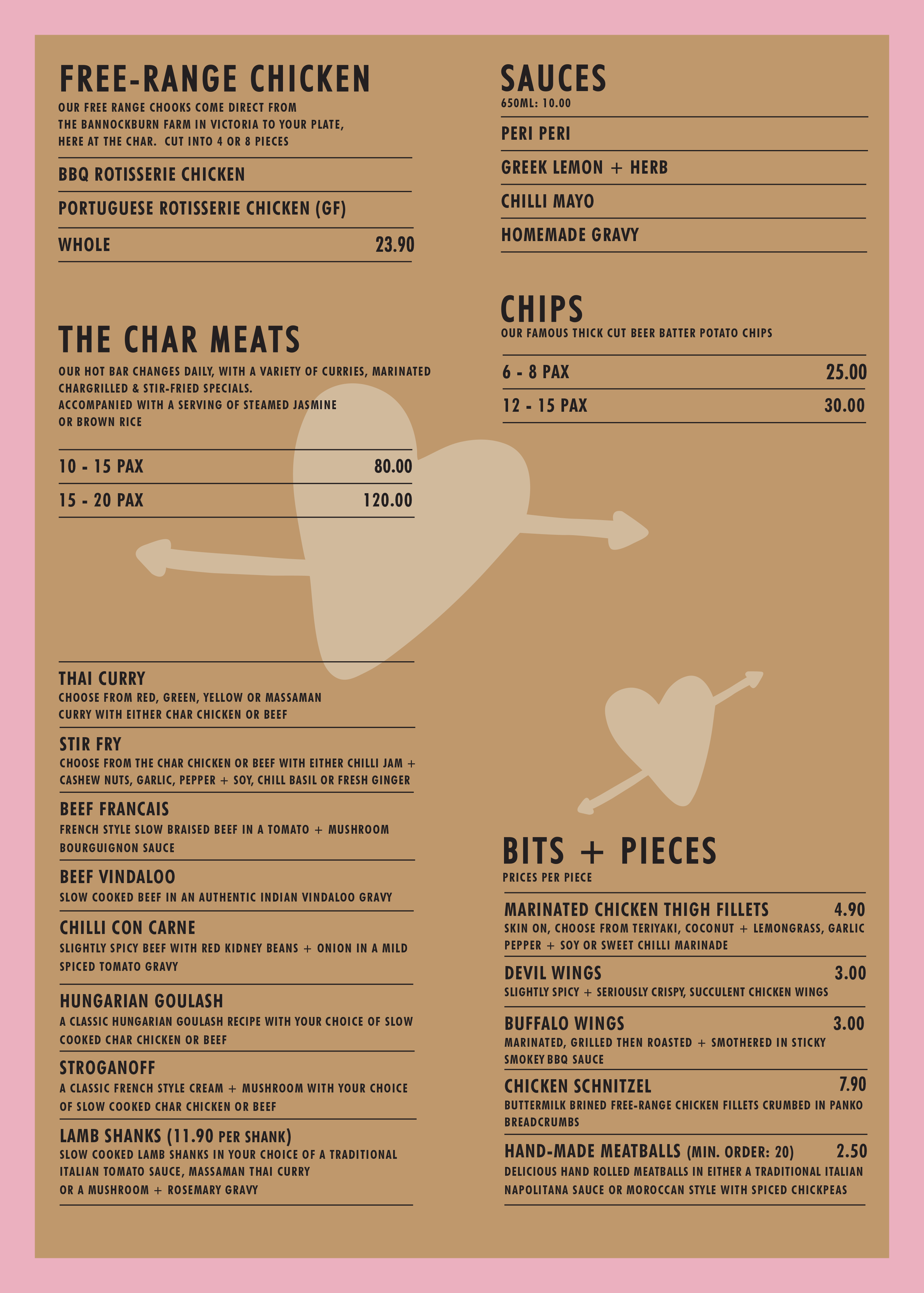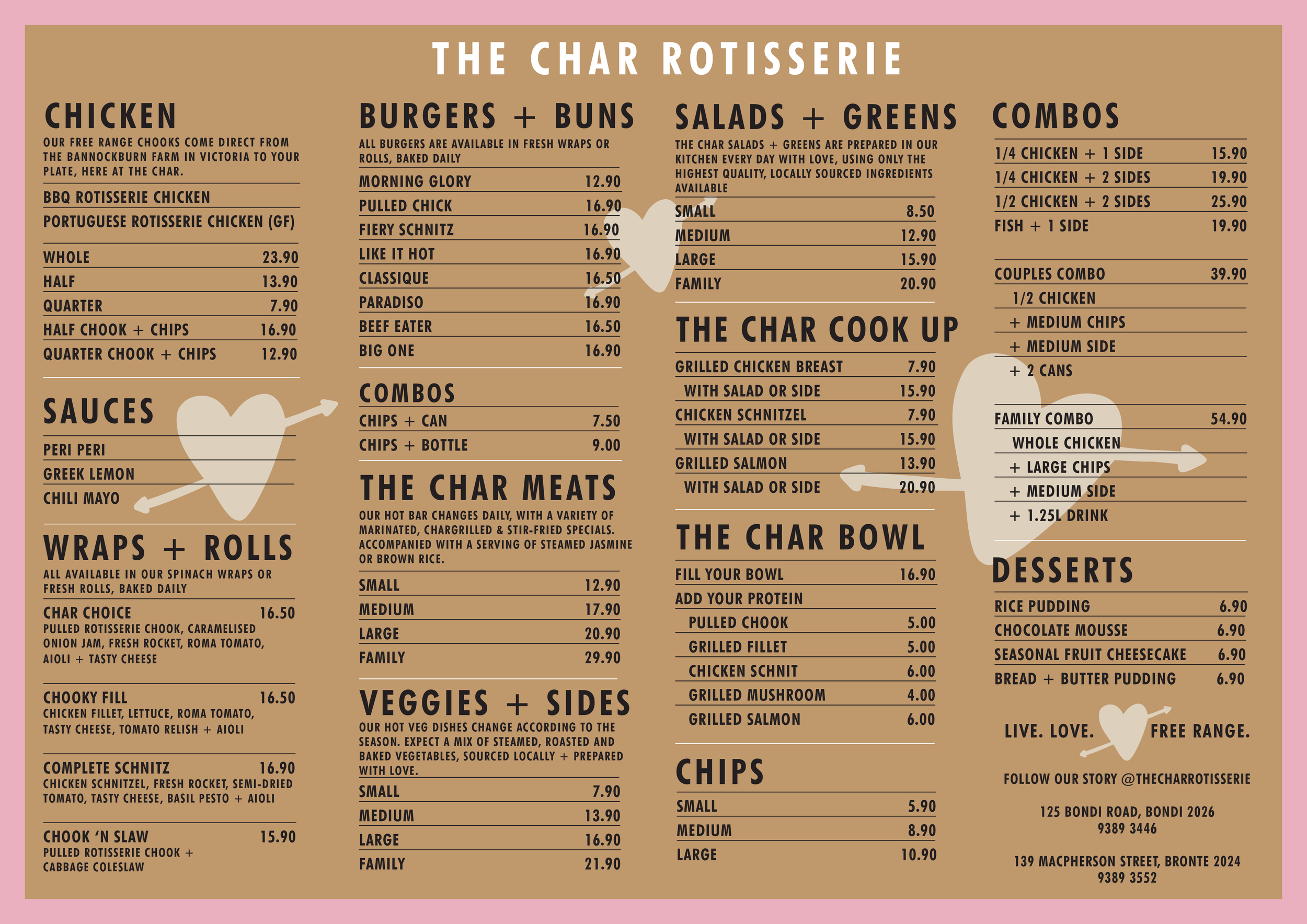 It was a piece of nutritional magic not wasted on the greeks, Egyptians, English, Yanks and now Bondi’s best, where you are welcomed with an outstretched pinkie to The Char, your local chicken dream team where perfectly cooked free-range rotisserie chicken is no longer wishful thinking, as you can see, a great chicken dinner is not just a tasty meal, it’s a dream come true.
